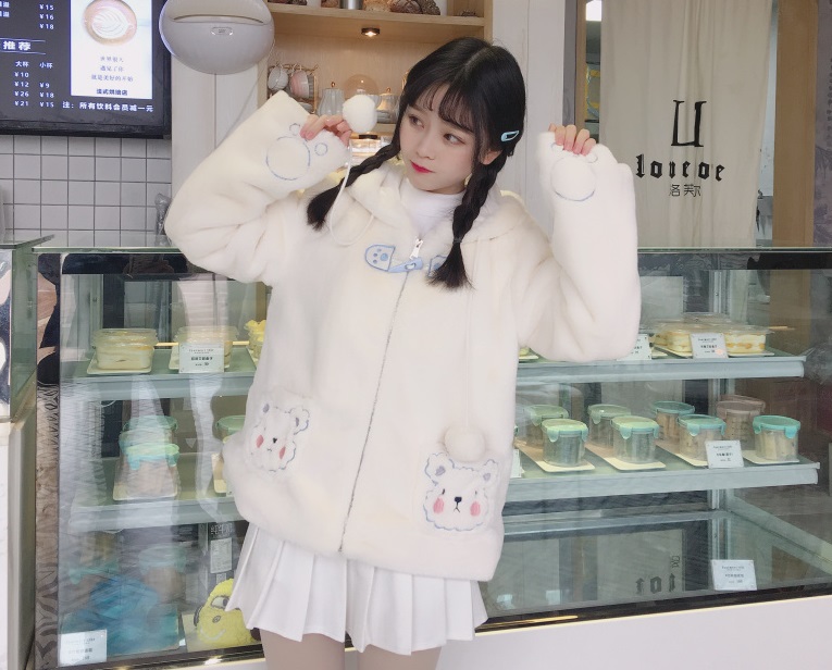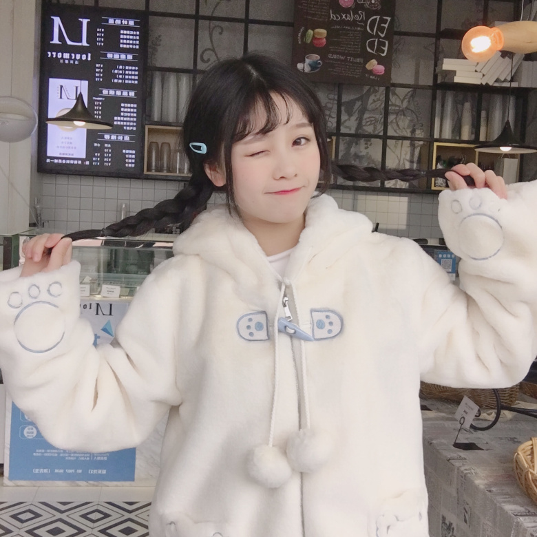 Japanese Cute Autumn Winter Sweet Girl Soft Plush Velvet Cotton Wool Girl Lolita Bear Ear Paw Loose Blue White Coat