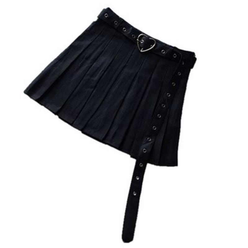 Black Harajuku Goth High Waist A-Line Pleated Mini Skirt with Heart Belt