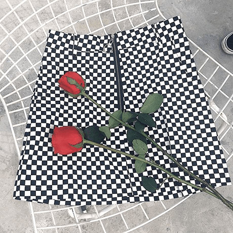 GRUNGE BLACK WHITE CHECKERED GRID FRONT ZIPPER SKIRT