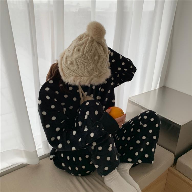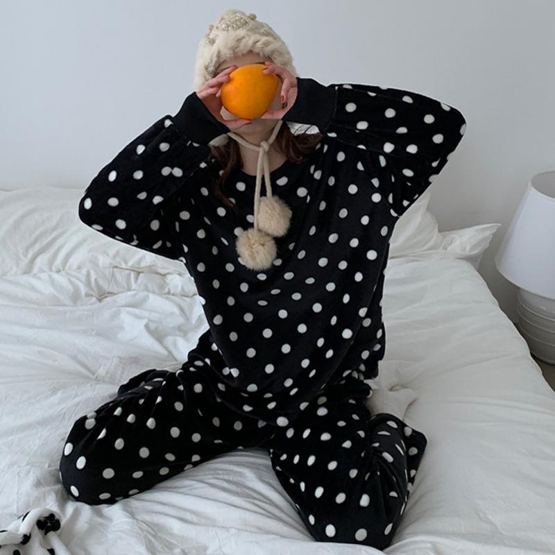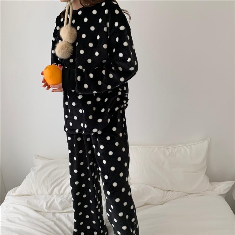 BLACK WHITE PLUSH COMFY POLKA DOT 2 PIECE PAJAMA SET