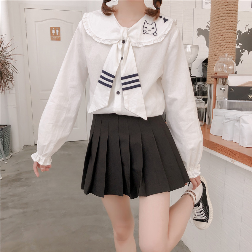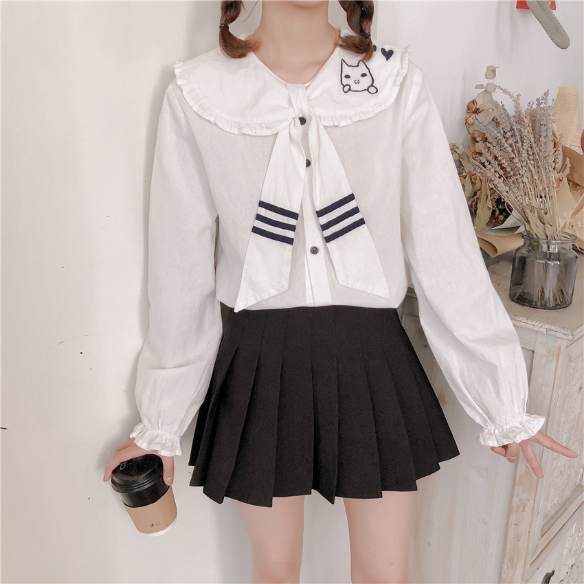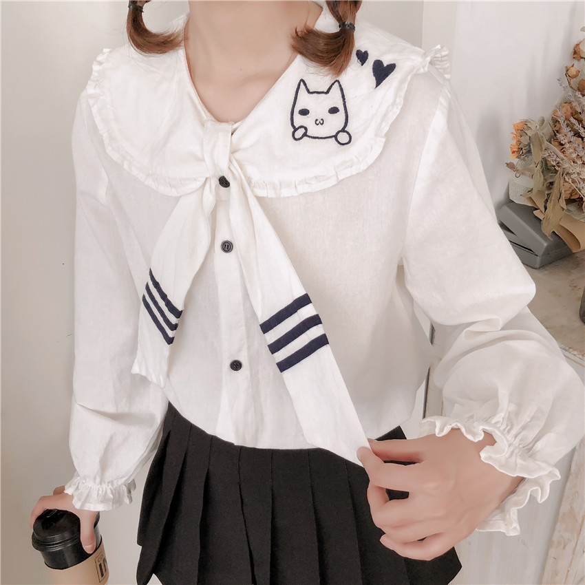 Japanese Sweet Girl Navy Collar Ruffled Cat Cartoon Embroidery White Shirt Blouse